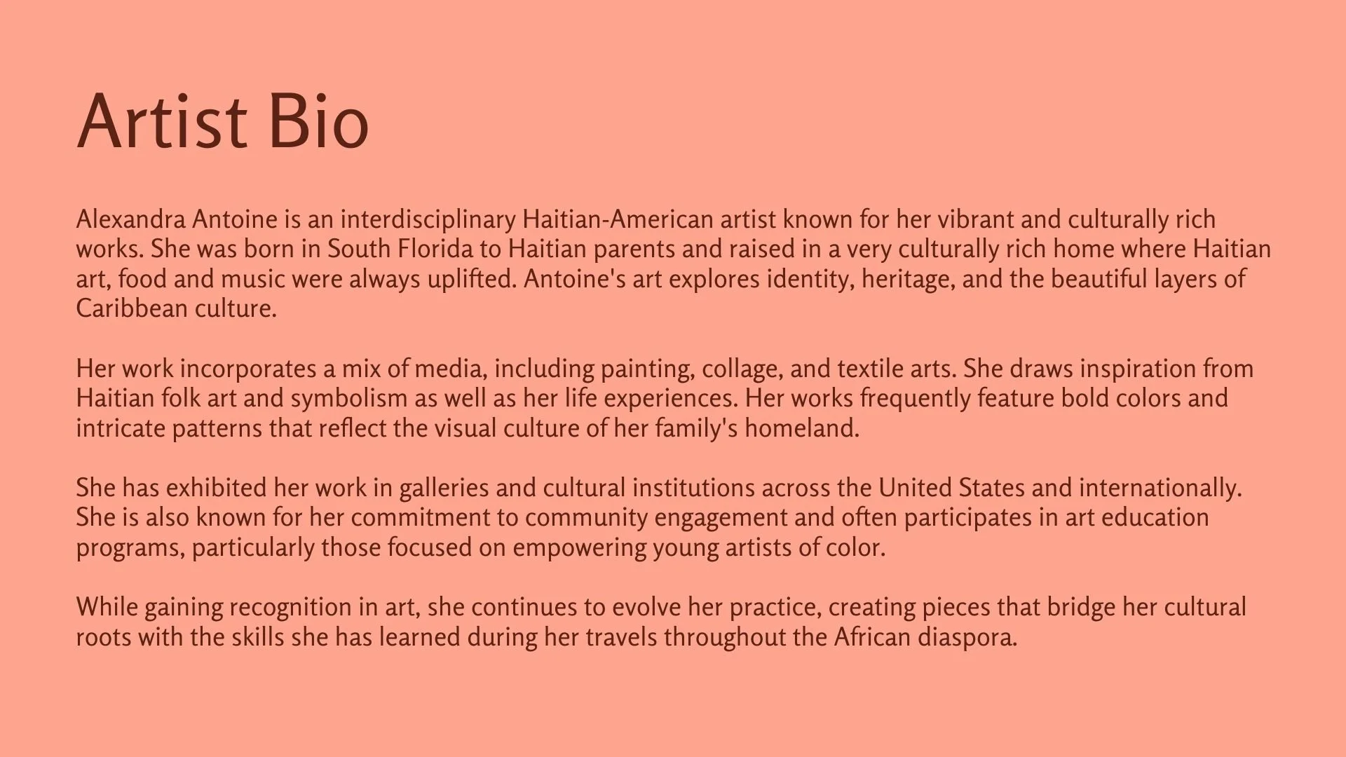 Meet our new Resident Artist! Alexandra brings expertise to the classroom, leading collage and mural projects with our students. We are excited to work her on the Hazel Johnson Memorial Gardens, a Mural at Aldridge, and the Bronzeville Green Youth Initiative. You can see more of her work here: https://www.alexandraantoine.com/